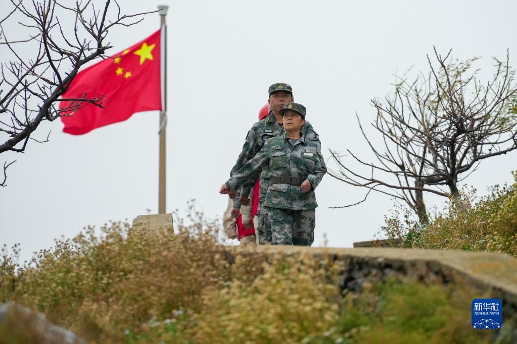 10月16日,在江蘇省連云港市灌云縣開山島,王仕花(前)、輪值民兵和江蘇電力開山島黨員服務(wù)隊(duì)隊(duì)員在島上巡邏。新華社記者 李博 攝