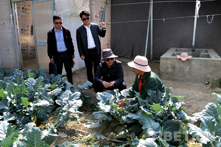 圖為次仁頓珠(左邊第三個戴灰色太陽帽為次仁頓珠)深入基層了解老百姓溫室菜棚經(jīng)營情況