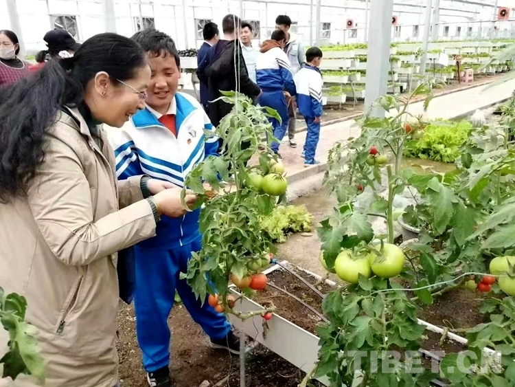 圖為次仁拉姆(左一)帶領那曲市特殊教育學校學生們“打卡”參觀那曲市某溫室大棚