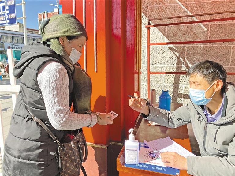 八廓商城市場(chǎng)部部長(zhǎng)卓嘎介紹說:“為廣大市民提供一個(gè)安全、祥和的購(gòu)物環(huán)境,我們?cè)谏虉?chǎng)設(shè)有5個(gè)進(jìn)出口,每個(gè)進(jìn)出口都需掃行程碼、測(cè)量體溫后才可進(jìn)入。因?yàn)橛行├先藳]有智能手機(jī),無法掃健康瑪,我們會(huì)登記姓名、身份證號(hào)、聯(lián)系方式。并且在增加的攤位旁增設(shè)消防器材,不定時(shí)巡邏。”