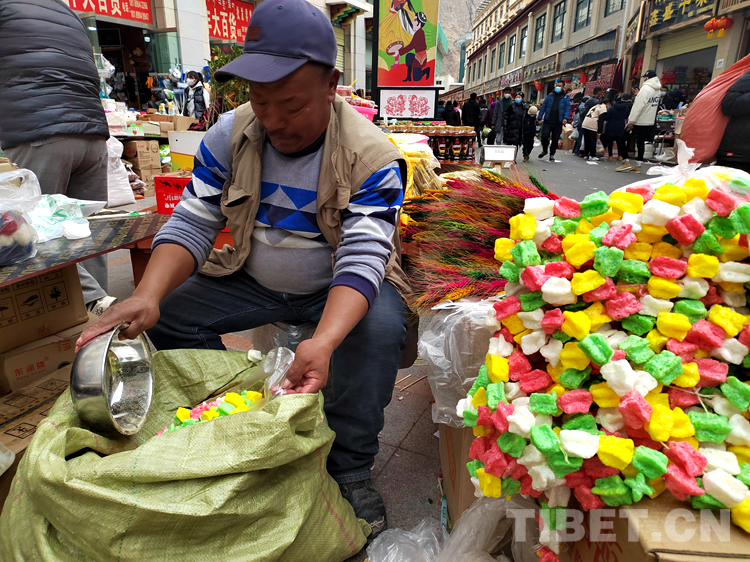 拉巴頓珠正忙碌著擺售賣年貨。喧鬧聲、音樂聲交織在一起,奏響了迎接新年的華美樂章。拉巴頓珠告訴記者,賣自家制作的年貨有幾天了,生意好得很。