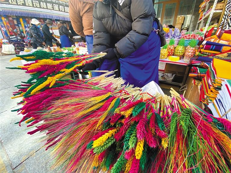 藏族姑娘索曲在展示出售的象征豐收的五彩麥穗(2月12日攝)。新華社記者 覺果 攝