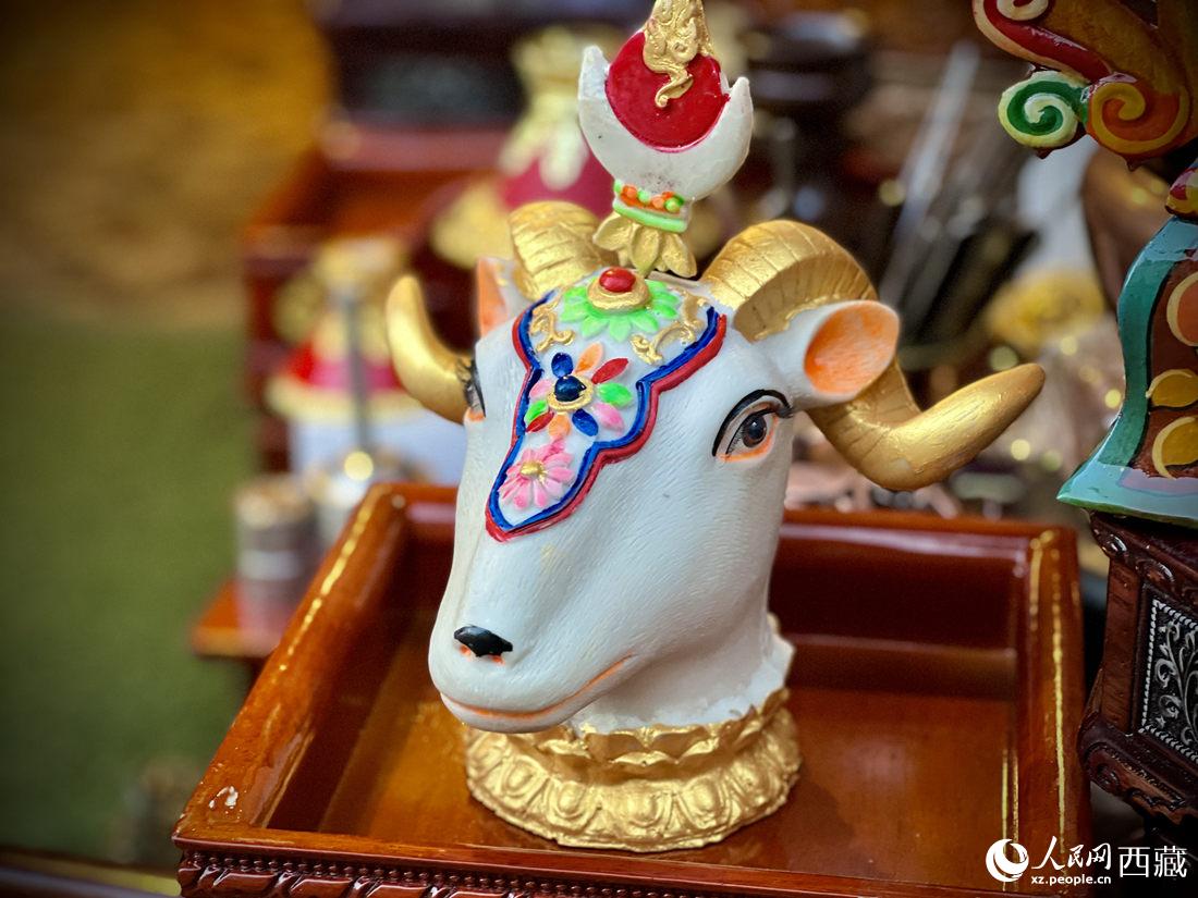 年貨市場上售賣的“隆果”。(在藏語中,“隆果” 是羊頭的意思,也是新年的諧音。它一般擺放在所有供品的中央,因?yàn)槿藗冋J(rèn)為“羊”是吉祥之物,同時(shí)也祈盼五谷豐登,六畜興旺。)人民網(wǎng) 次仁羅布攝