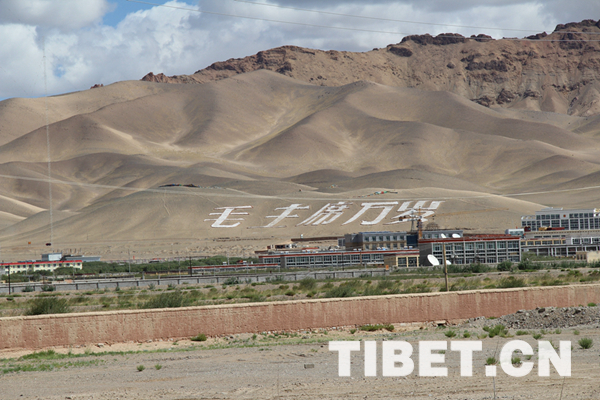 中國西藏網訊 進入阿里地區(qū)首府噶爾縣獅泉河鎮(zhèn)時,獅泉河城北山坡上“毛主席萬歲”五個巨字格外醒目,當?shù)厝擞H切地稱之為“萬歲山”。