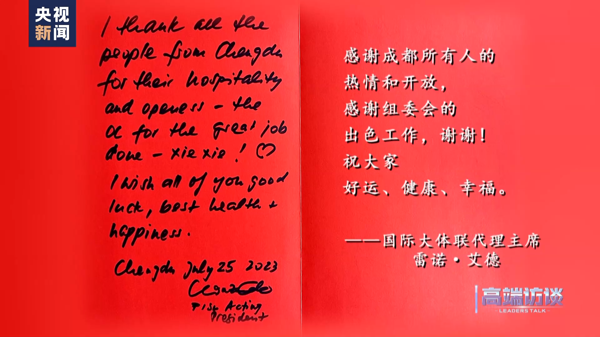 國際大體聯(lián)代理主席雷諾 艾德在接受總臺專訪后題詞:感謝成都所有人的熱情和開放,感謝組委會的出色工作,謝謝!祝大家好運、健康、幸福。
