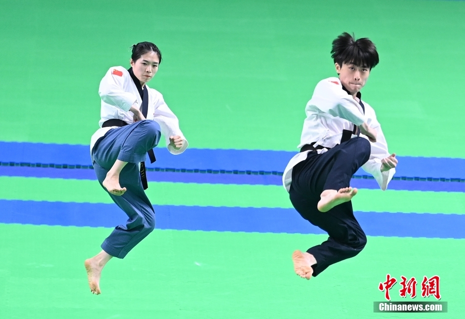 7月30日,在成都舉行的第31屆世界大學生夏季運動會跆拳道項目混合雙人品勢比賽中,中國運動員梁婕(左)與劉思玥獲得金牌。中新社記者 陳超 攝