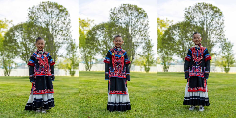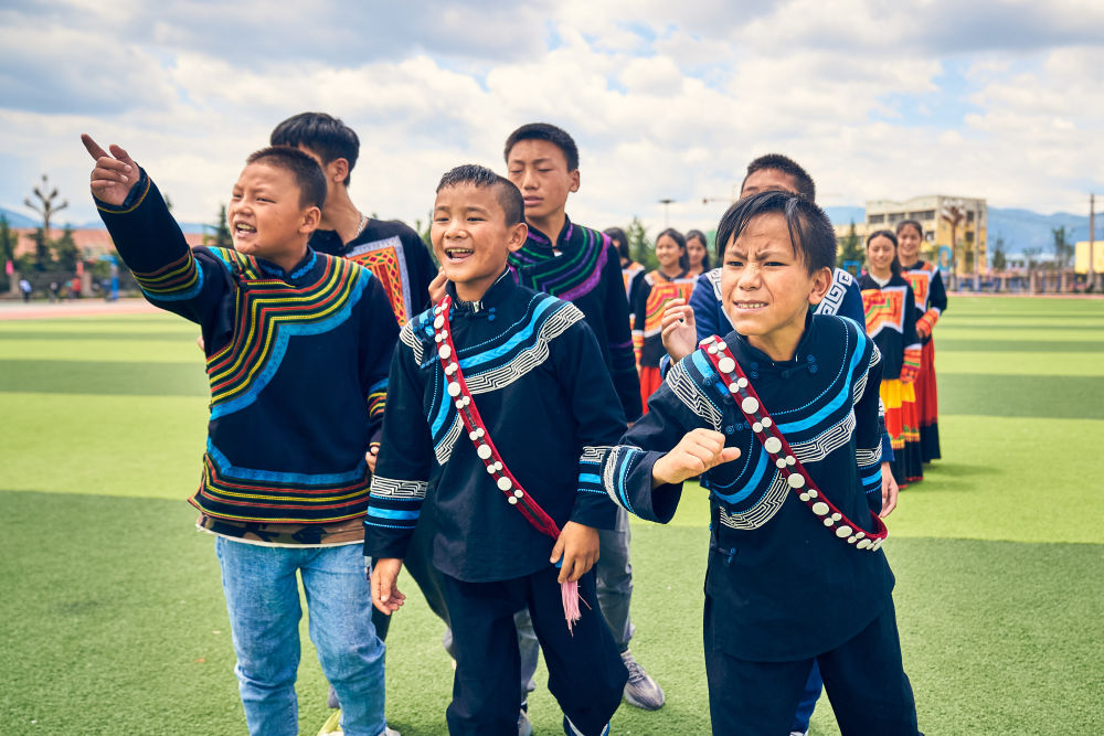 7月2日,在昭覺(jué)縣萬(wàn)達(dá)融創(chuàng)紅絲帶愛(ài)心學(xué)校參與排練的俄地惹漢(前左)、馬杰英(前中)和吉合拉作(前右)。(受訪者供圖)