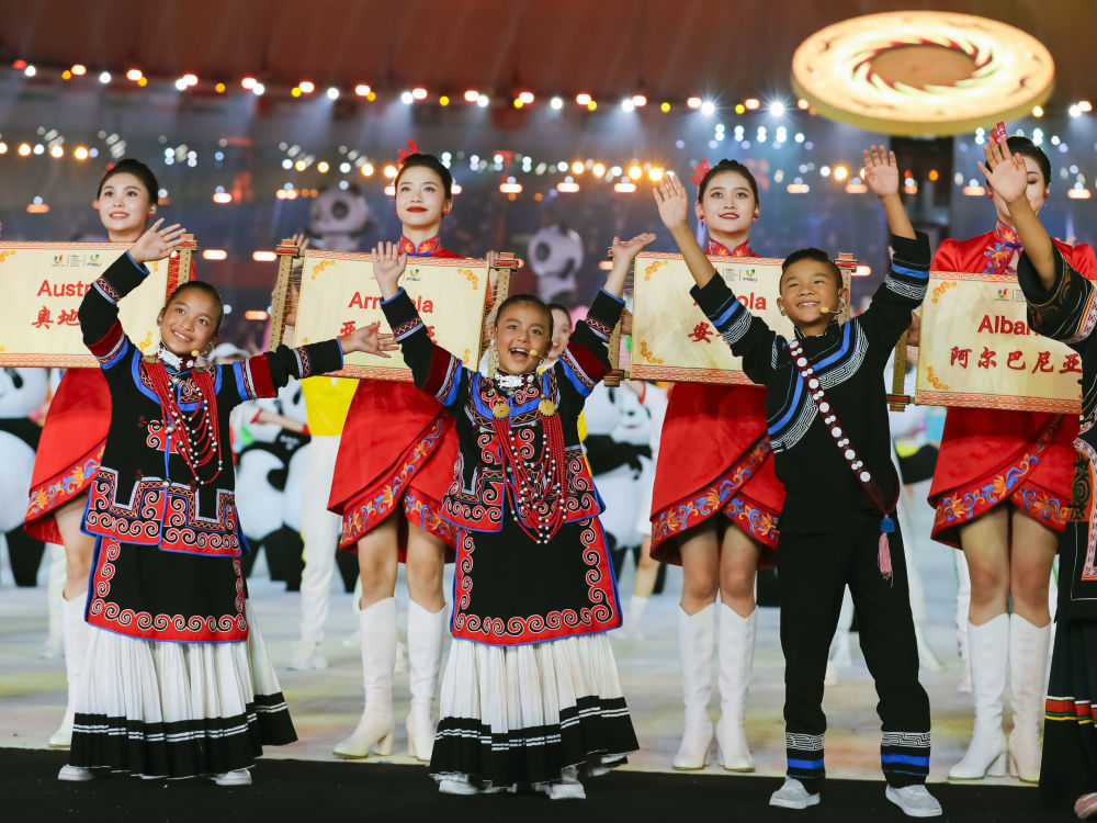 7月28日,來(lái)自四川涼山彝族自治州的孩子們?cè)诔啥即筮\(yùn)會(huì)開幕式上歌唱。新華社記者 陳澤國(guó) 攝