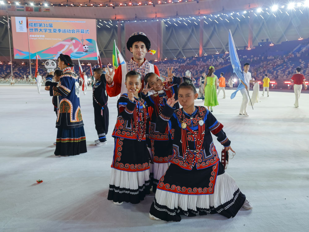 7月23日,在成都大運(yùn)會(huì)開幕式彩排結(jié)束后,俄地惹漢、馬杰英和吉和拉作(前左至右)與來(lái)自新疆的塔吉克族演員拍攝合影。新華社記者沈伯韓 攝