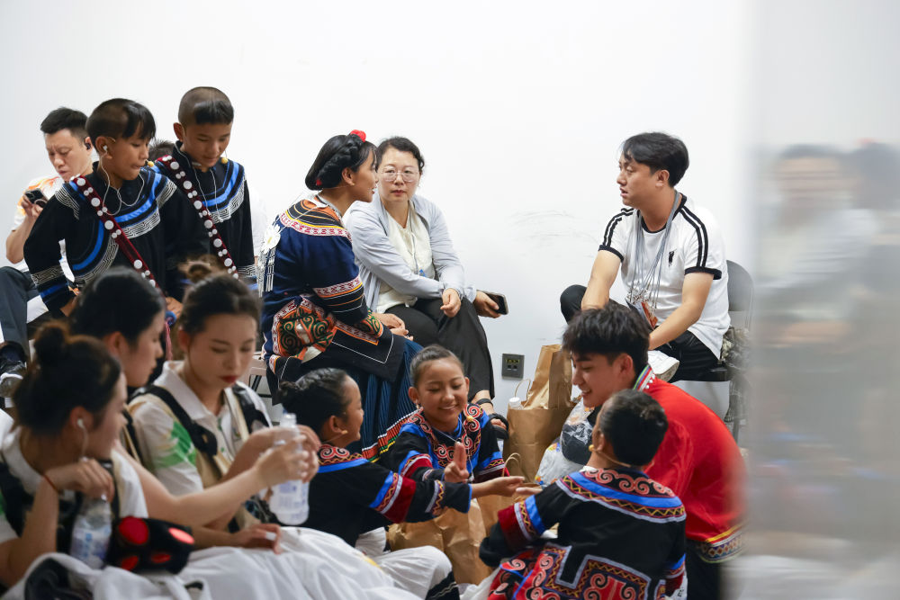 7月16日,在成都大運(yùn)會(huì)開幕式彩排現(xiàn)場(chǎng)拍攝的候場(chǎng)中的吉子醫(yī)生(左)和吉朵史拉(右)。新華社記者胥冰潔 攝
