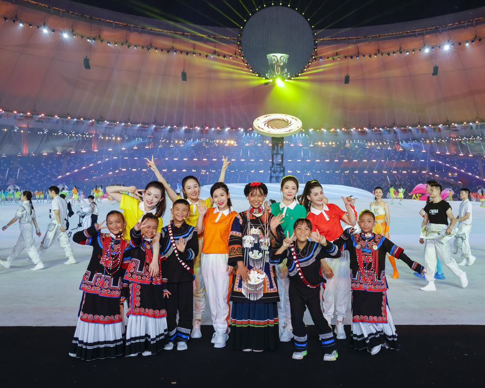 7月23日,成都大運(yùn)會(huì)開幕式彩排結(jié)束后,一些演員主動(dòng)和來(lái)自大涼山的孩子們拍攝合影。新華社記者 沈伯韓 攝
