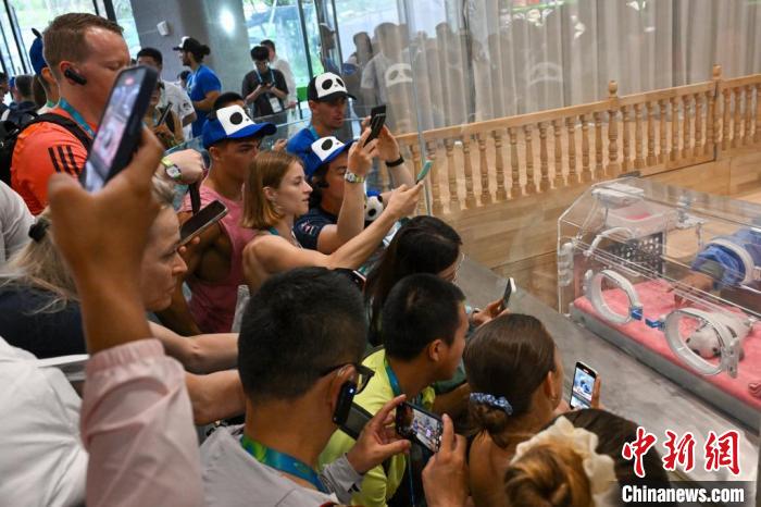 8月1日,成都大運會的大學生運動員們參觀成都大熊貓繁育研究基地,圖為運動員圍觀大熊貓幼仔。 中新社記者 趙文宇 攝