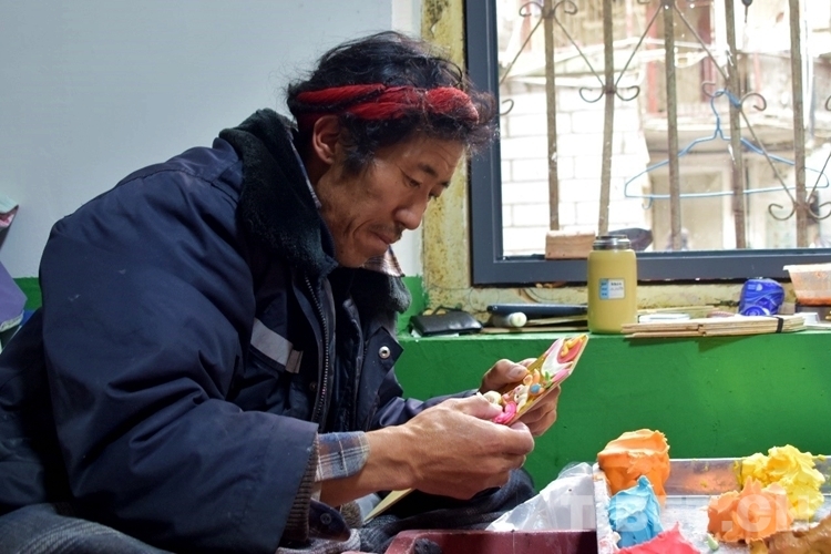 “我們一般在藏歷新年前20天左右到達拉薩。買酥油,和礦物染色原料調(diào)至成泥狀后便開始捏制?!钡┰稣f,普松鄉(xiāng)有制作酥油花的傳統(tǒng),每年藏歷新年臨近,他們便結(jié)伴來到拉薩制作酥油花銷售。