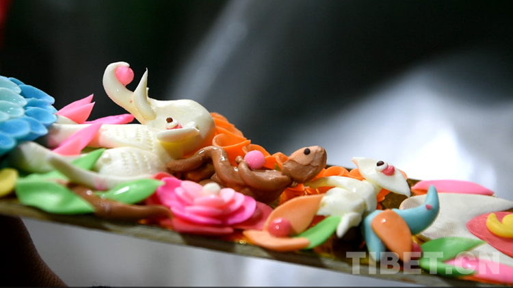 酥油花是藏民族雕塑藝術(shù)的一種特殊形式,它是以人物、花卉、樹木、飛禽、走獸等為主題的一種手工油塑藝術(shù),具有悠久的歷史。藏歷新年期間,西藏群眾會在切瑪盒的左右兩邊分別裝滿糌粑和炒青稞,然后在上面插上象征五谷豐登的“羅薩美朵”(彩色青稞穗)和寓意吉祥的酥油花。(中國西藏網(wǎng) 記者/次旦拉姆)