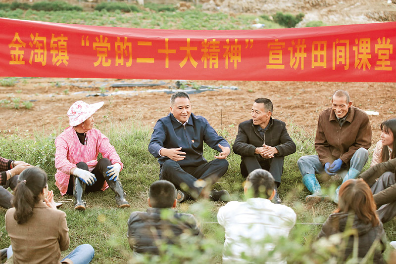 圖為2022年12月18日,理論宣講員在福建省南安市金淘鎮(zhèn)中心村“黨建+”百畝馬鈴薯基地為村民宣講黨的二十大精神。 中新社發(fā) 謝貴明/攝