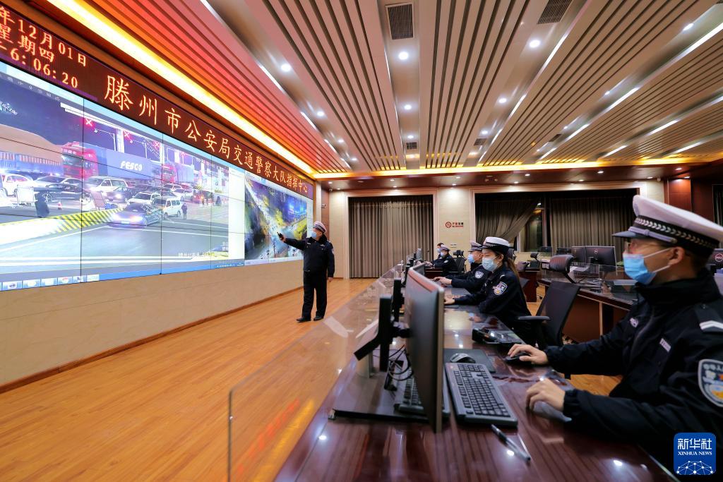 12月1日,在山東省滕州市公安局交警大隊(duì)指揮中心,借助“情、指、勤、督”一體化智慧交通管理平臺(tái),民警對(duì)各個(gè)路口及路段交通流數(shù)據(jù)進(jìn)行綜合分析。新華社發(fā)(鐘自增 攝)