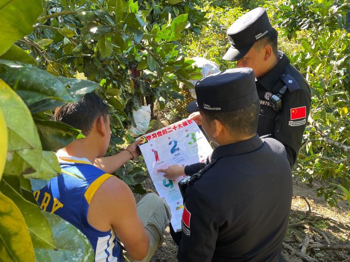 墨脫縣邊境派出所民警在墨脫鎮(zhèn)米日村蜜桔種植基地為群眾宣講黨的二十大精神。