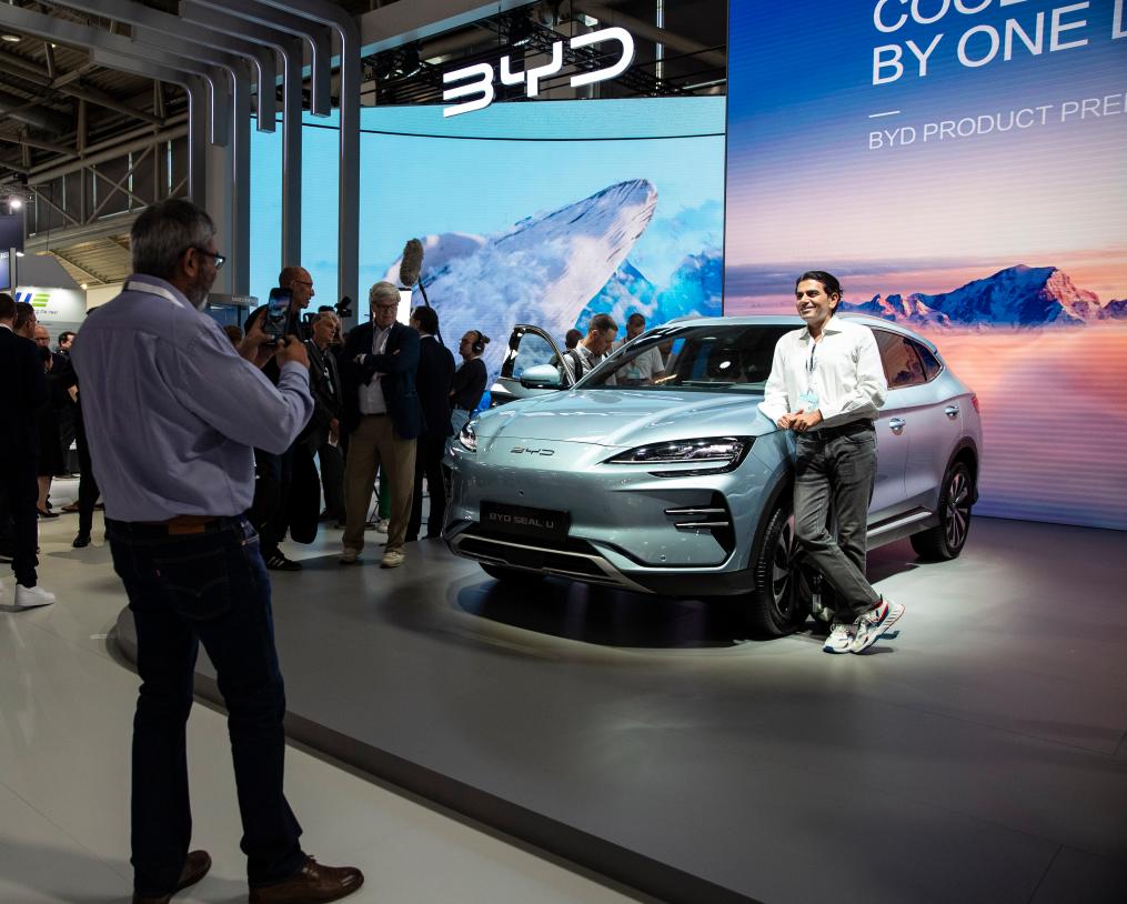 9月4日,在德國(guó)慕尼黑國(guó)際車展媒體預(yù)展上,參觀者在比亞迪品牌發(fā)布會(huì)現(xiàn)場(chǎng)與BYD SEAL U汽車合影。新華社記者 張帆 攝