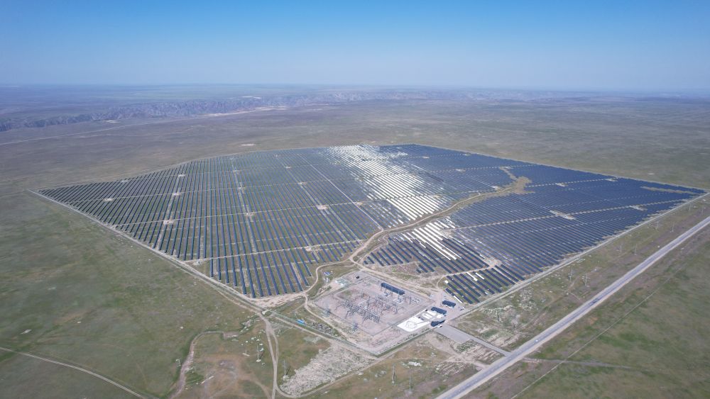 這是5月4日拍攝的哈薩克斯坦阿拉木圖州卡普恰蓋100兆瓦光伏電站(無人機(jī)照片)。這里的太陽能光伏板通過中歐班列運輸至此。