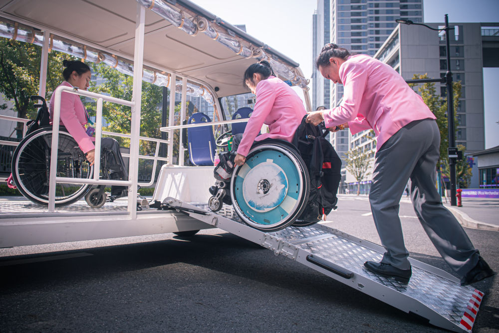 10月16日,中國(guó)體育代表團(tuán)成員在杭州亞殘運(yùn)村內(nèi)乘坐無(wú)障礙接駁車出行。新華社記者 江漢 攝