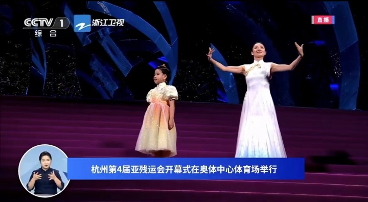 10月22日杭州亞殘運(yùn)會(huì)開幕式上,表演者用手語“唱”國歌。潮新聞?dòng)浾?楊朝波 攝