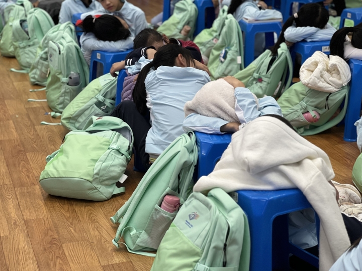 除了排練,他們還有作業(yè)和日常生活。排練現(xiàn)場(chǎng),時(shí)常能見到孩子們?cè)趭^筆疾書或者抓住碎片時(shí)間小憩,作業(yè)和打卡一次都沒落下?!拔覀?nèi)粘Mㄖ啪毜臅r(shí)候,也會(huì)喊他們帶上作業(yè),即便在開幕式上,后臺(tái)還碼著他們的書包,作業(yè)都是隨身攜帶的?!?/p>
