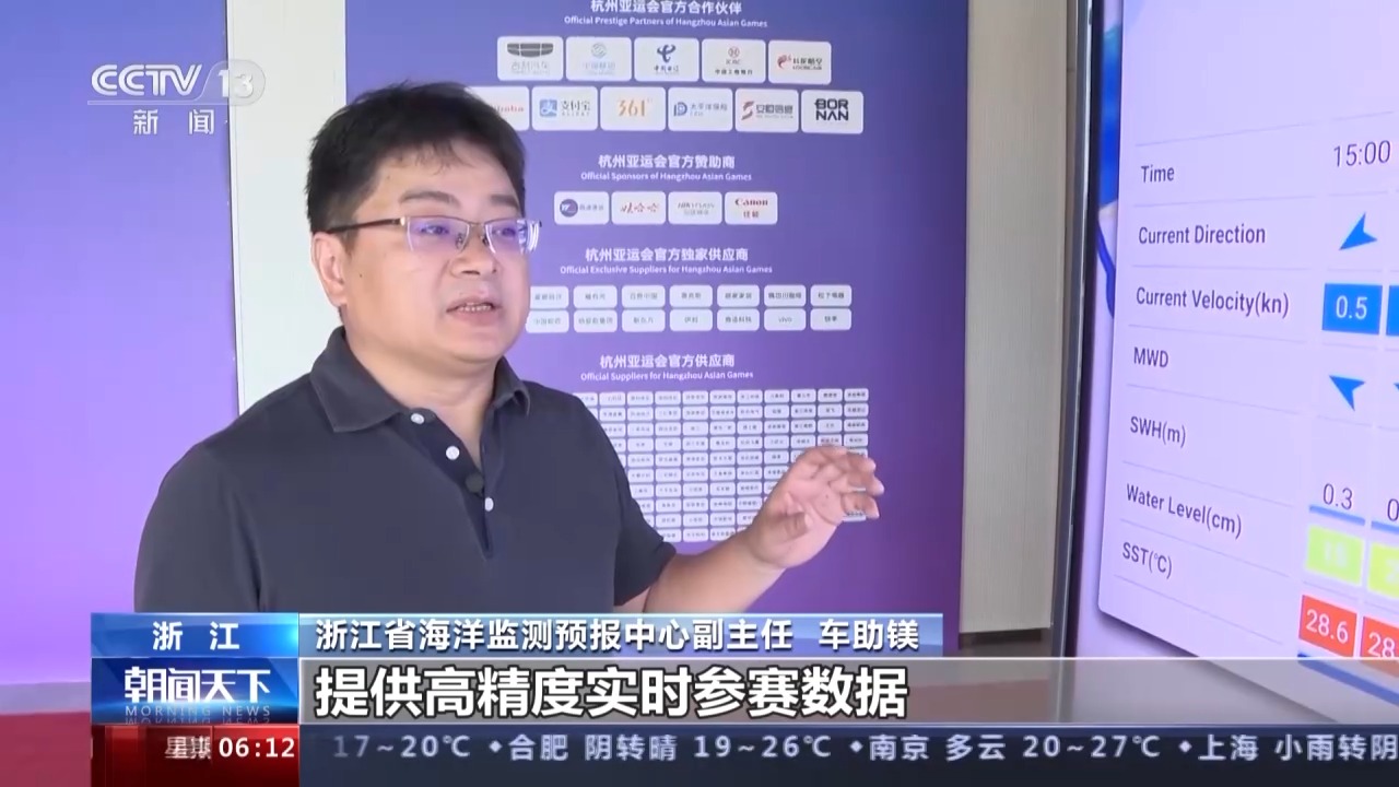 浙江省海洋監(jiān)測(cè)預(yù)報(bào)中心副主任 車(chē)助鎂:這是未來(lái)三小時(shí)的海洋預(yù)報(bào)信息,流向、流速、平均波向、涌高、水位、水溫,這些信息將為亞運(yùn)會(huì)帆船運(yùn)動(dòng)員提供高精度實(shí)時(shí)的參賽數(shù)據(jù)。