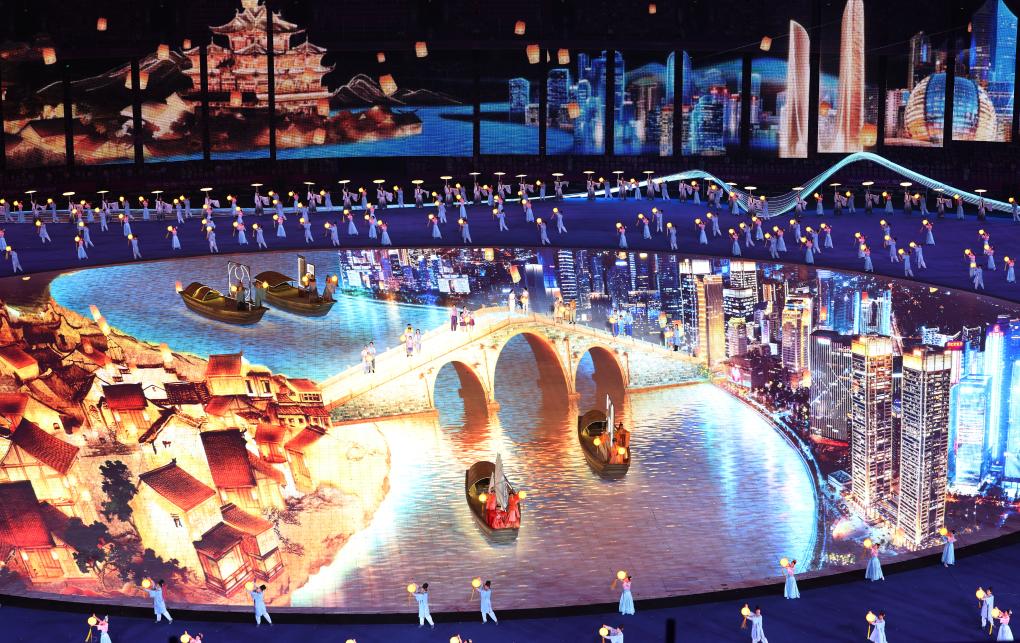 這是9月23日拍攝的杭州亞運會開幕式“拱宸橋”連通古今。新華社記者 楊磊 攝