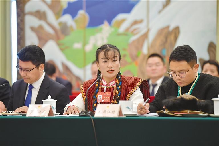 圖為3月6日上午,西藏代表團(tuán)舉行全體會(huì)議,傳達(dá)學(xué)習(xí)習(xí)近平總書(shū)記在參加江蘇代表團(tuán)審議時(shí)的重要講話精神,繼續(xù)審議政府工作報(bào)告 ,審查計(jì)劃報(bào)告和預(yù)算報(bào)告。圖為全國(guó)人大代表扎西尼瑪(中)在會(huì)上發(fā)言。
