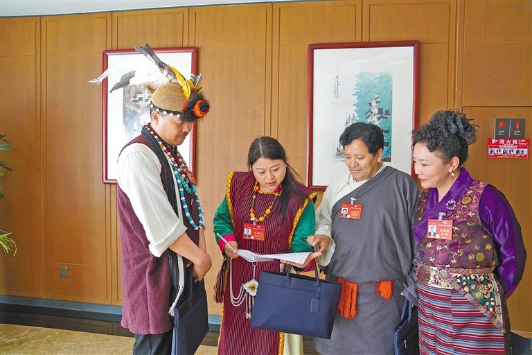 圖為3月6日下午,十四屆全國(guó)人大二次會(huì)議西藏代表團(tuán)舉行團(tuán)組開(kāi)放活動(dòng)。46家中外媒體的80余名記者前來(lái)采訪。圖為全國(guó)人大代表羅布央宗(中)在現(xiàn)場(chǎng)回答記者提問(wèn)。 本報(bào)記者 旦增西旦 張思雨 攝