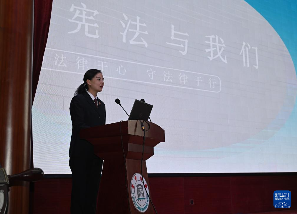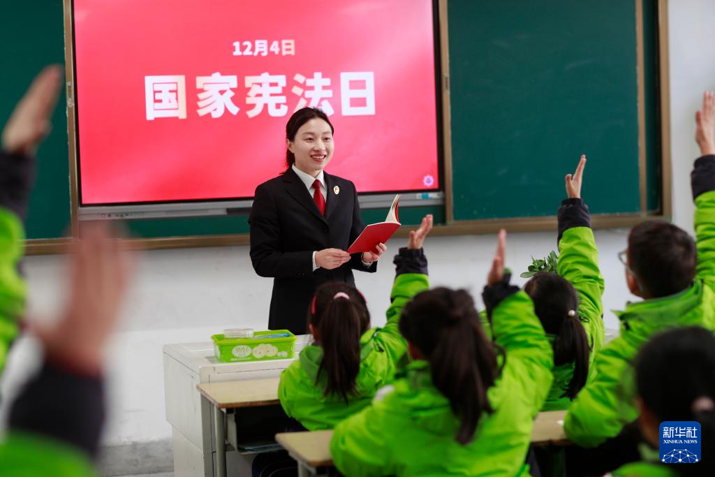 12月3日,河南省洛陽市汝陽縣人民法院法官為縣直屬初級中學(xué)學(xué)生講解新中國憲法發(fā)展歷程。