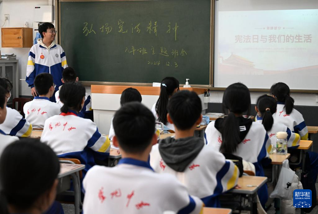 12月3日,天津市南開區(qū)崇化中學(xué)學(xué)生在國家憲法日教育宣傳主題班會(huì)上進(jìn)行分享。