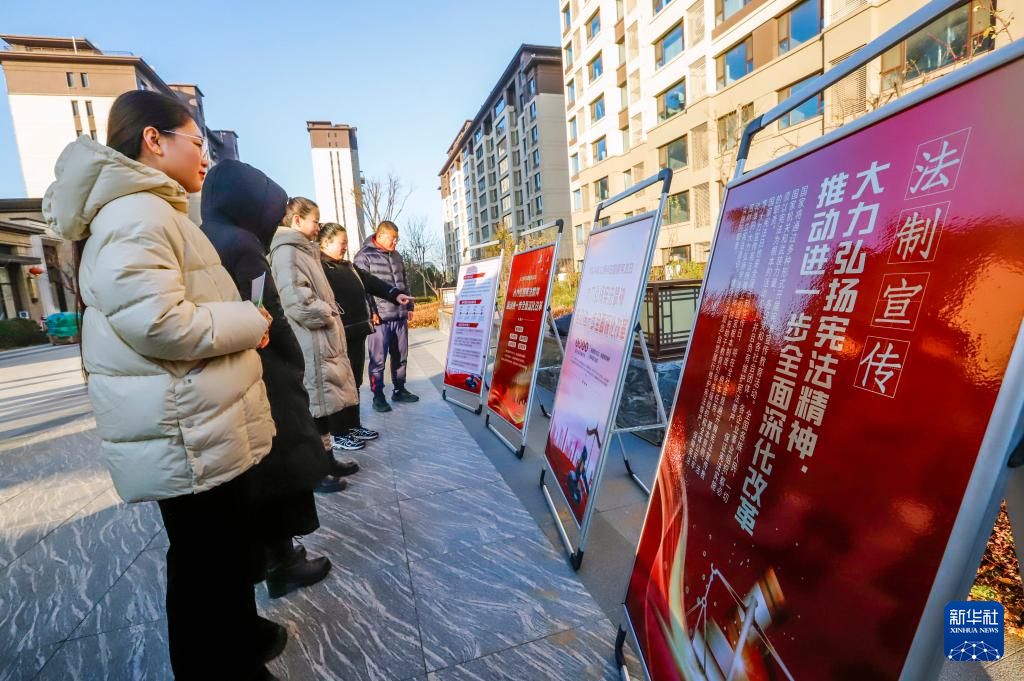 12月3日,河北省遵化市華明路街道的社區(qū)居民在參觀憲法知識(shí)宣傳展板。