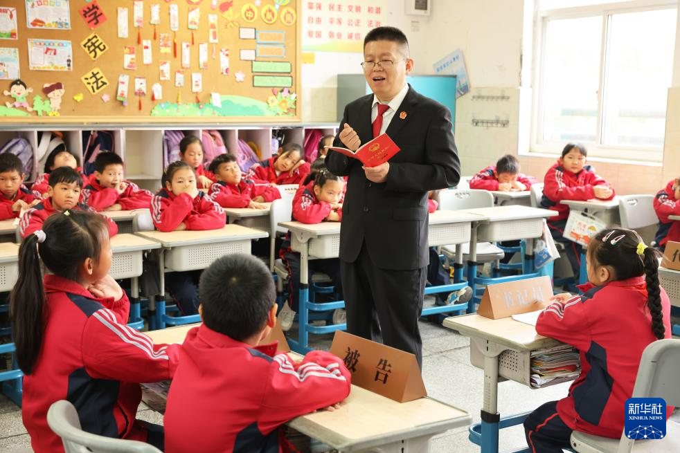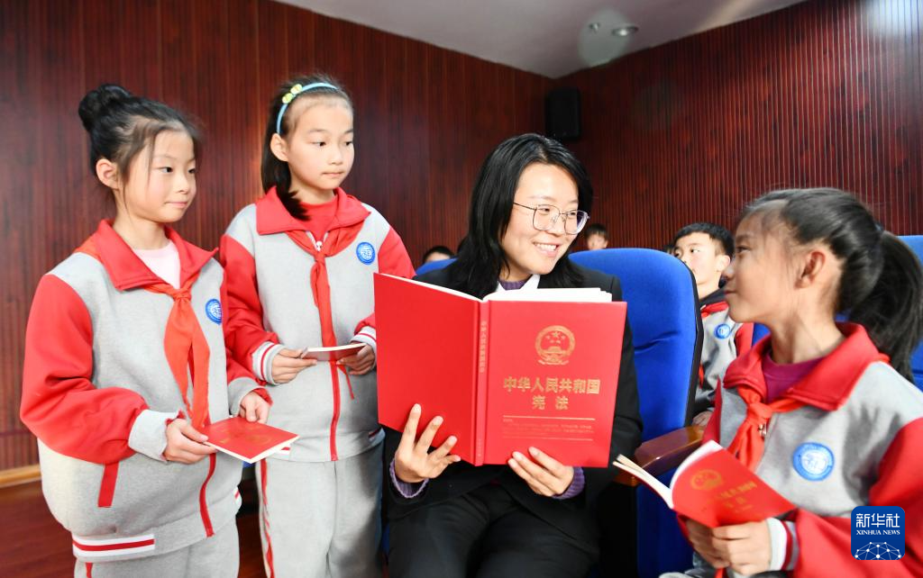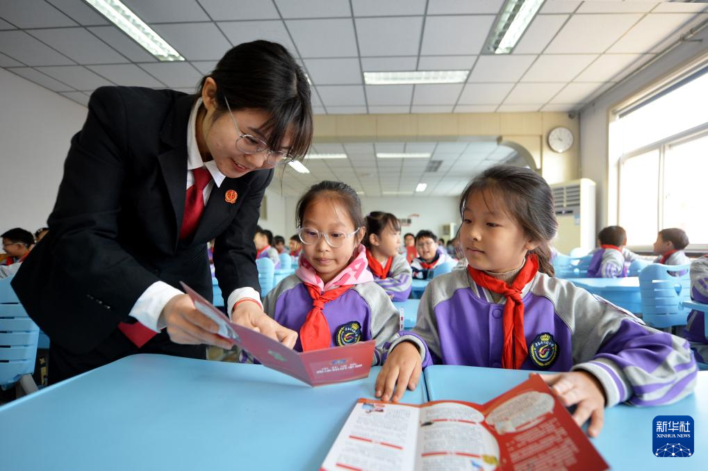 12月3日,在山東青島壽光路小學(xué)開展的憲法知識(shí)進(jìn)校園活動(dòng)上,法官在指導(dǎo)學(xué)生學(xué)習(xí)憲法知識(shí)。