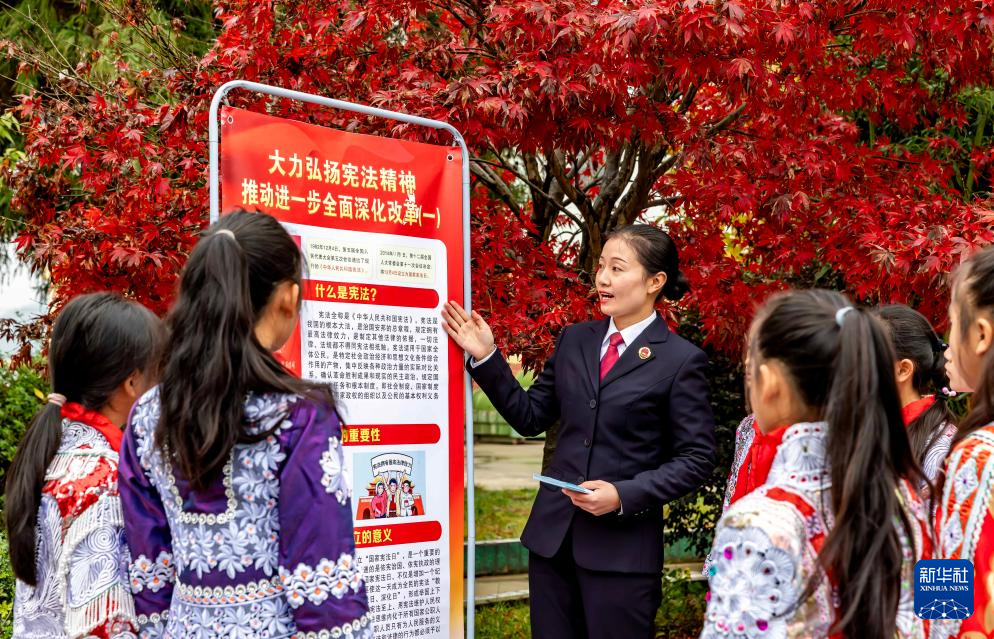 12月3日,貴州省黔西市人民檢察院的檢察干警在新仁苗族鄉(xiāng)化竹小學(xué)為學(xué)生普及憲法知識(shí)。