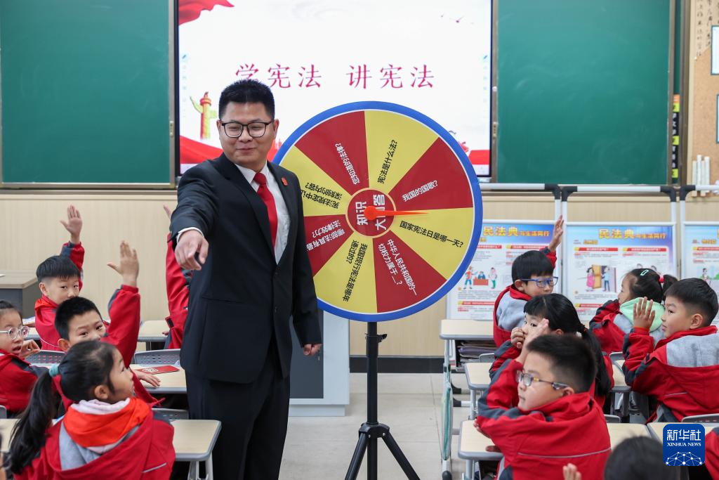 12月3日,在浙江省湖州市德清縣雷甸鎮(zhèn)中心小學(xué),德清縣人民法院雷甸人民法庭工作人員通過知識(shí)大轉(zhuǎn)盤為學(xué)生普及憲法知識(shí)。
