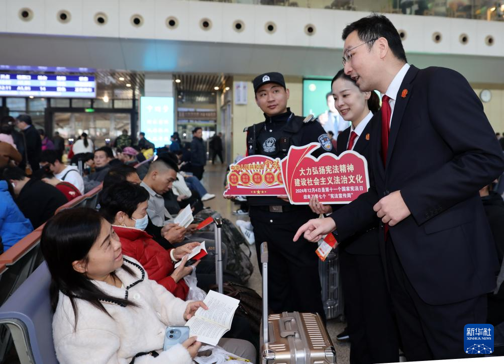 12月3日,武漢鐵路運(yùn)輸中級法院法官在武漢火車站為旅客宣傳憲法知識(shí)。