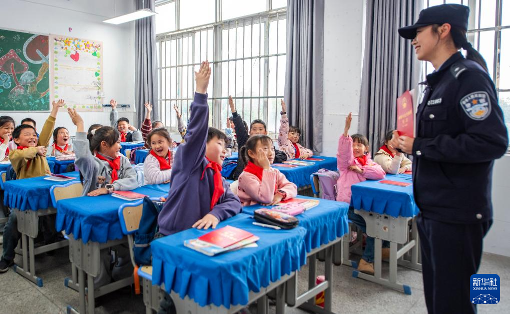 12月3日,在安徽省蕪湖市繁昌區(qū)孫村鎮(zhèn)中心小學(xué),民警為小學(xué)生講解憲法知識(shí)。