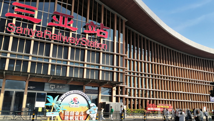 圖為海南三亞火車站門前第十二屆全國少數(shù)民族傳統(tǒng)體育運(yùn)動會標(biāo)識 攝影:劉莉