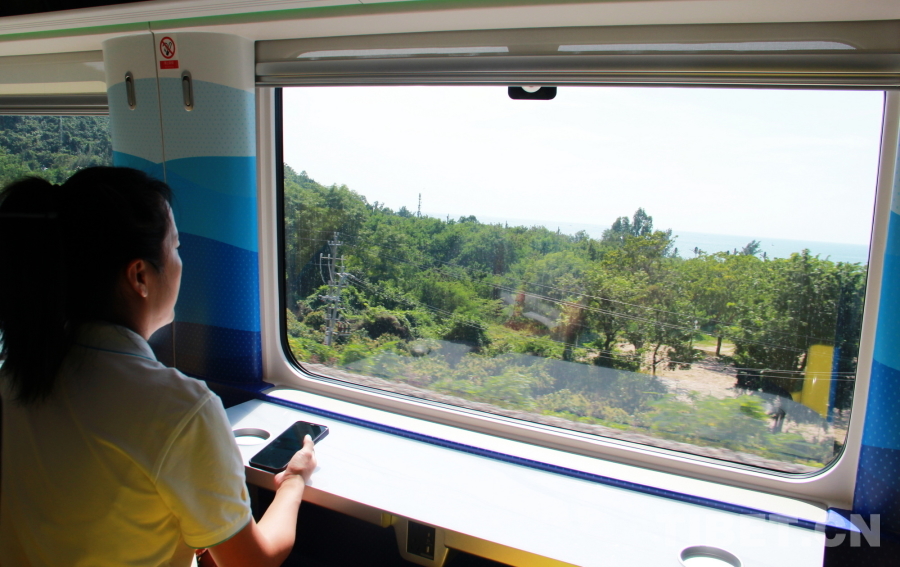 圖為三樂旅游鐵路列車“活力海洋”主題車廂,座位面朝大海,乘客隔窗可見海南三亞著名的天涯海角景區(qū) 攝影:劉莉
