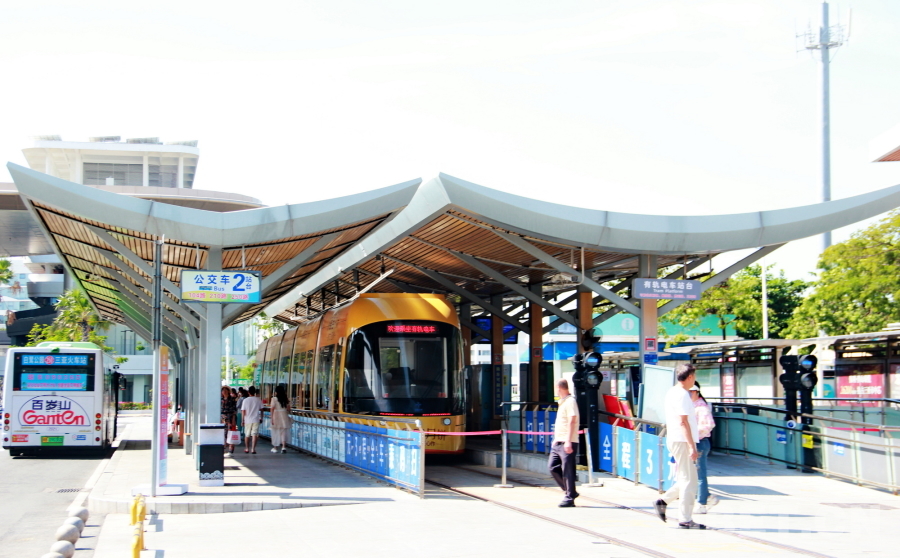 圖為海南三亞火車站外的公交車、有軌電車站 攝影:劉莉