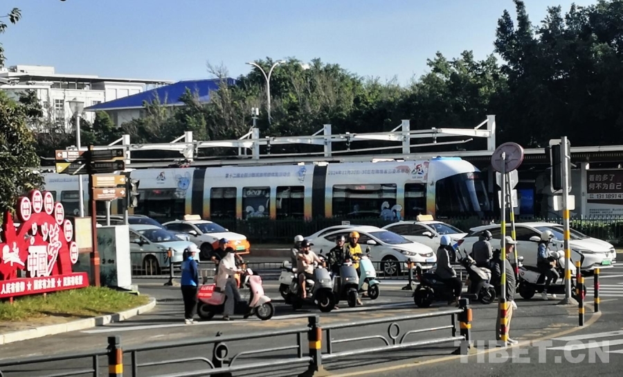 圖為涂裝第十二屆全國少數(shù)民族傳統(tǒng)體育運(yùn)動會標(biāo)識的有軌電車駛過海南三亞街頭 攝影:劉莉