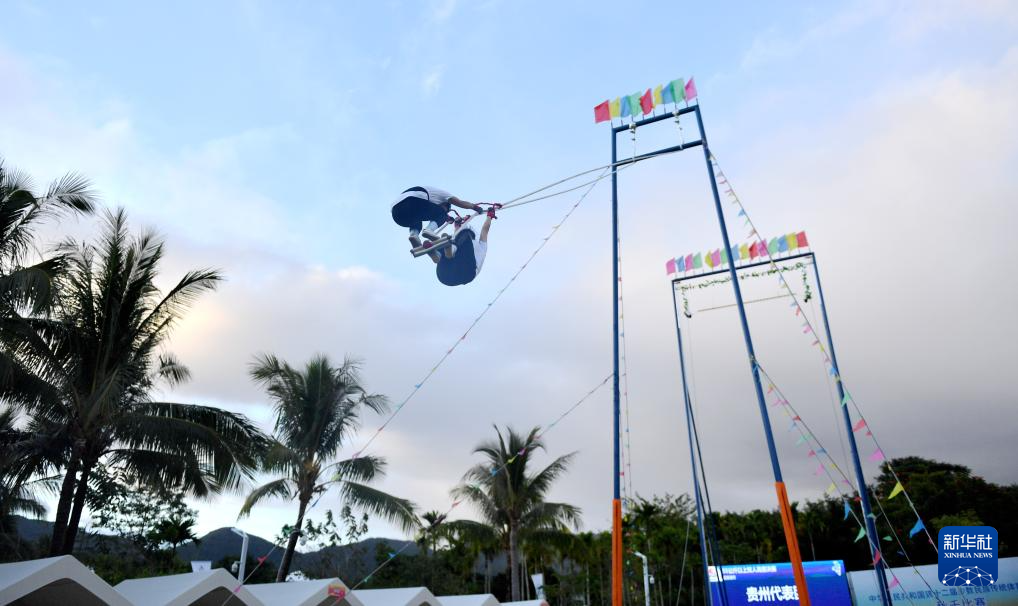 當(dāng)日,第十二屆全國少數(shù)民族傳統(tǒng)體育運(yùn)動(dòng)會(huì)秋千55公斤以上雙人高度決賽在海南三亞舉行。