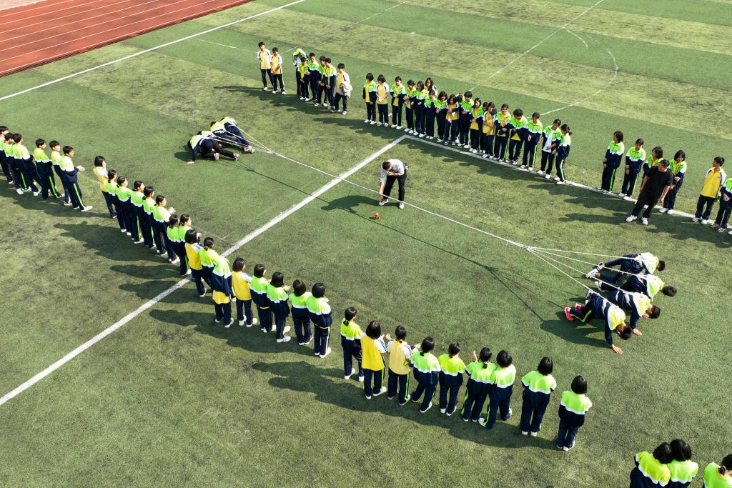 11月6日,廣西玉林市民族中學(xué)的學(xué)生們在跳竹竿舞(無人機照片)