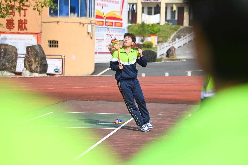 11月6日,廣西玉林市民族中學(xué)的學(xué)生們在進行背簍繡球的比賽