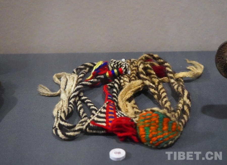 圖為“宗山號角——紀念西藏江孜抗英保衛(wèi)戰(zhàn)120周年主題展”展品——烏爾朵,一種牧民放牧牛羊用的皮制工具,可以把拳頭大小的石頭裹起來甩出去,用以驅(qū)趕或圍攏牲畜。攝影:王茜