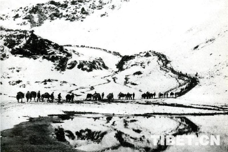 圖為1951年10月,進(jìn)藏部隊越過海拔六千余米的冷拉大雪山向拉薩前進(jìn)