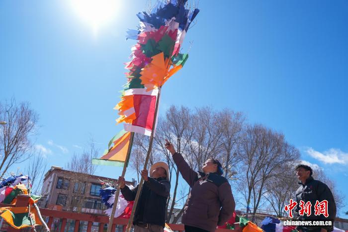 2月5日,臨近藏歷新年,在西藏自治區(qū)拉薩市街頭,農(nóng)牧民正縫制五彩經(jīng)幡樹(shù)。五彩經(jīng)幡樹(shù)是藏族民眾在藏歷新年前必備的年貨之一。藏歷新年期間,藏族民眾會(huì)選擇一個(gè)良辰吉日,為自家的房頂更換五彩經(jīng)幡樹(shù),祈求新的一年里五谷豐登,吉祥如意。