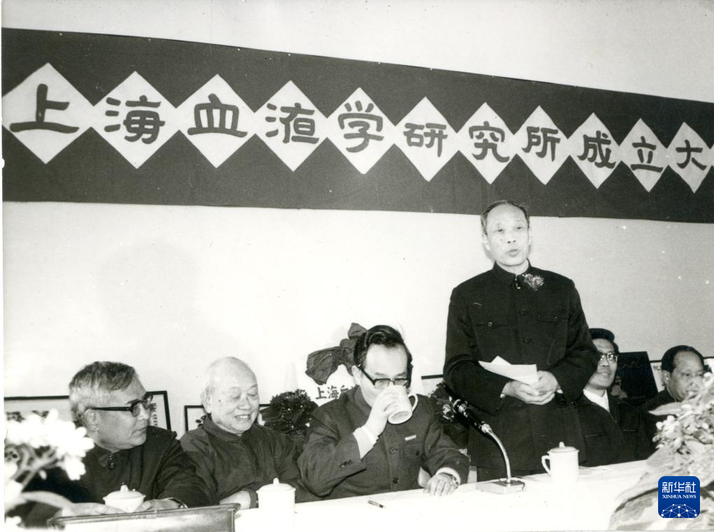 1987年3月23日,王振義(左四)參加上海血液學(xué)研究所揭牌儀式。新華社發(fā)(上海交通大學(xué)醫(yī)學(xué)院供圖)