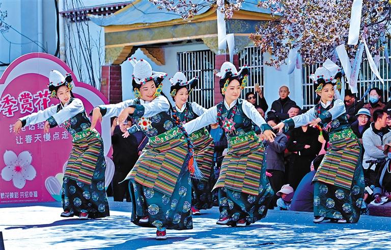 3月27日,“繁花映彩 共繪幸福”首屆文化藝術(shù)周暨 “3·28”西藏百萬(wàn)農(nóng)奴解放紀(jì)念日活動(dòng)在拉薩市城關(guān)區(qū)軍民路開幕。圖為活動(dòng)現(xiàn)場(chǎng)歌舞表演。記者 王敏 攝